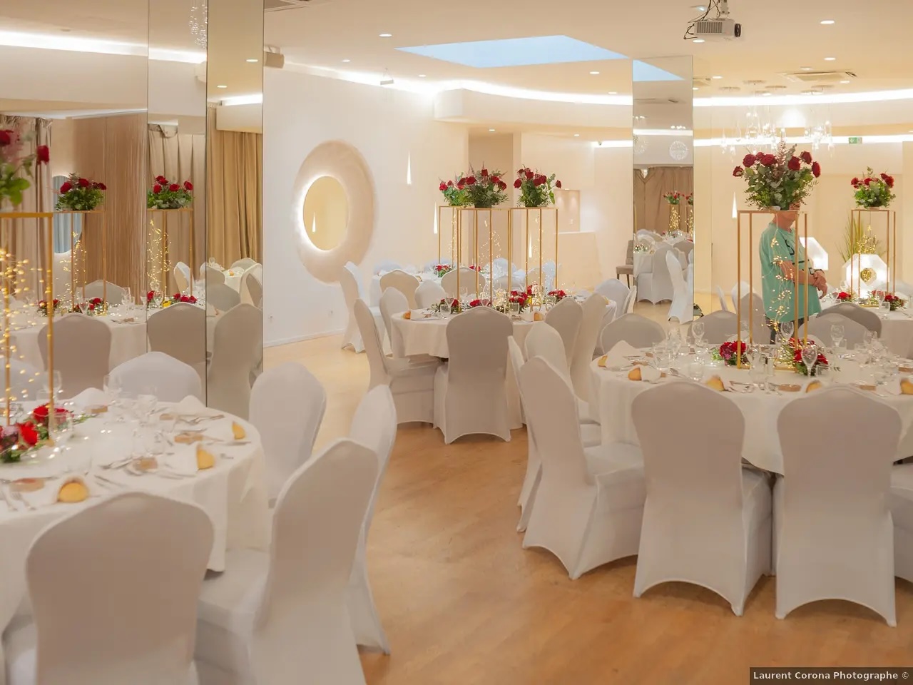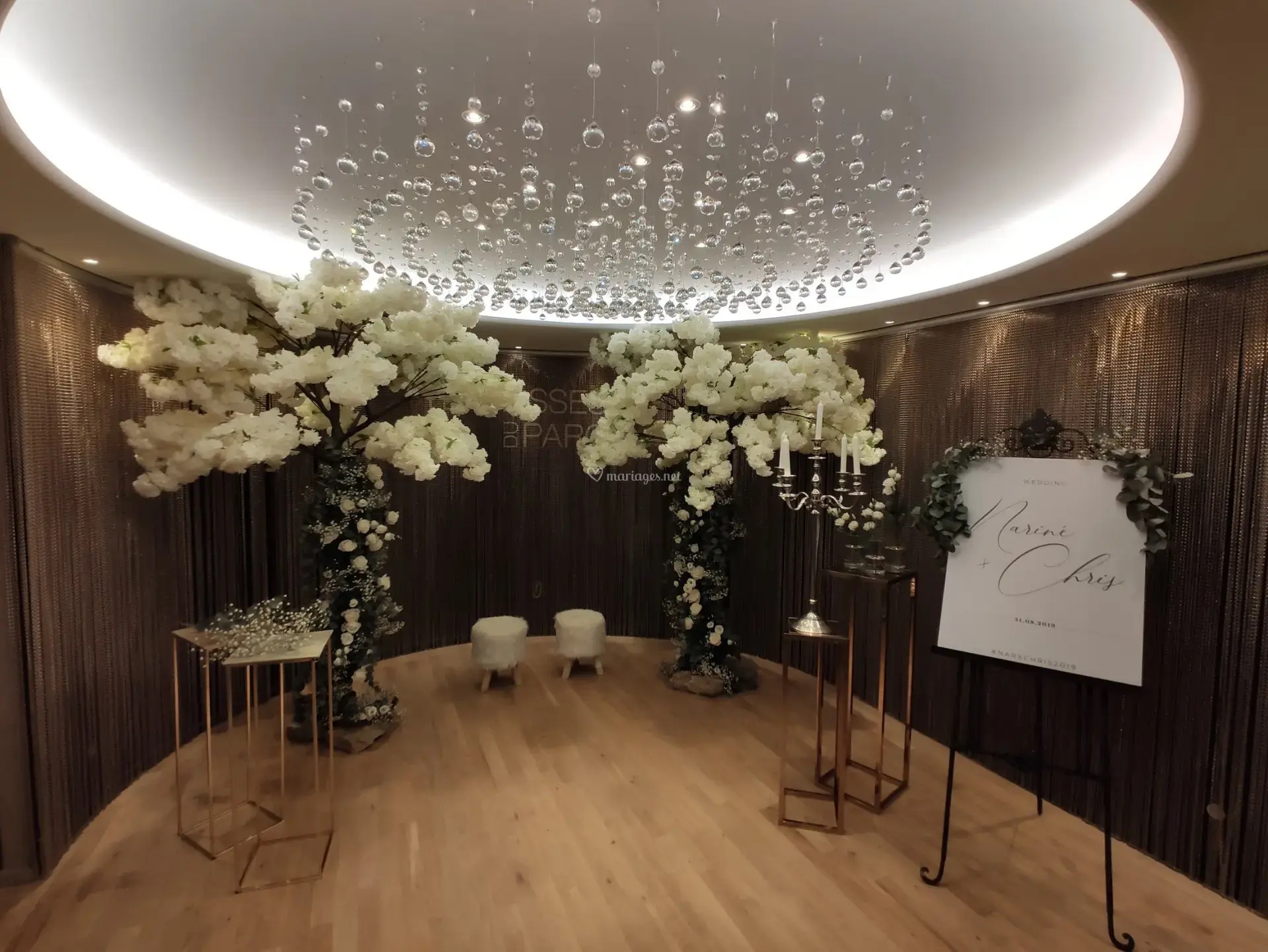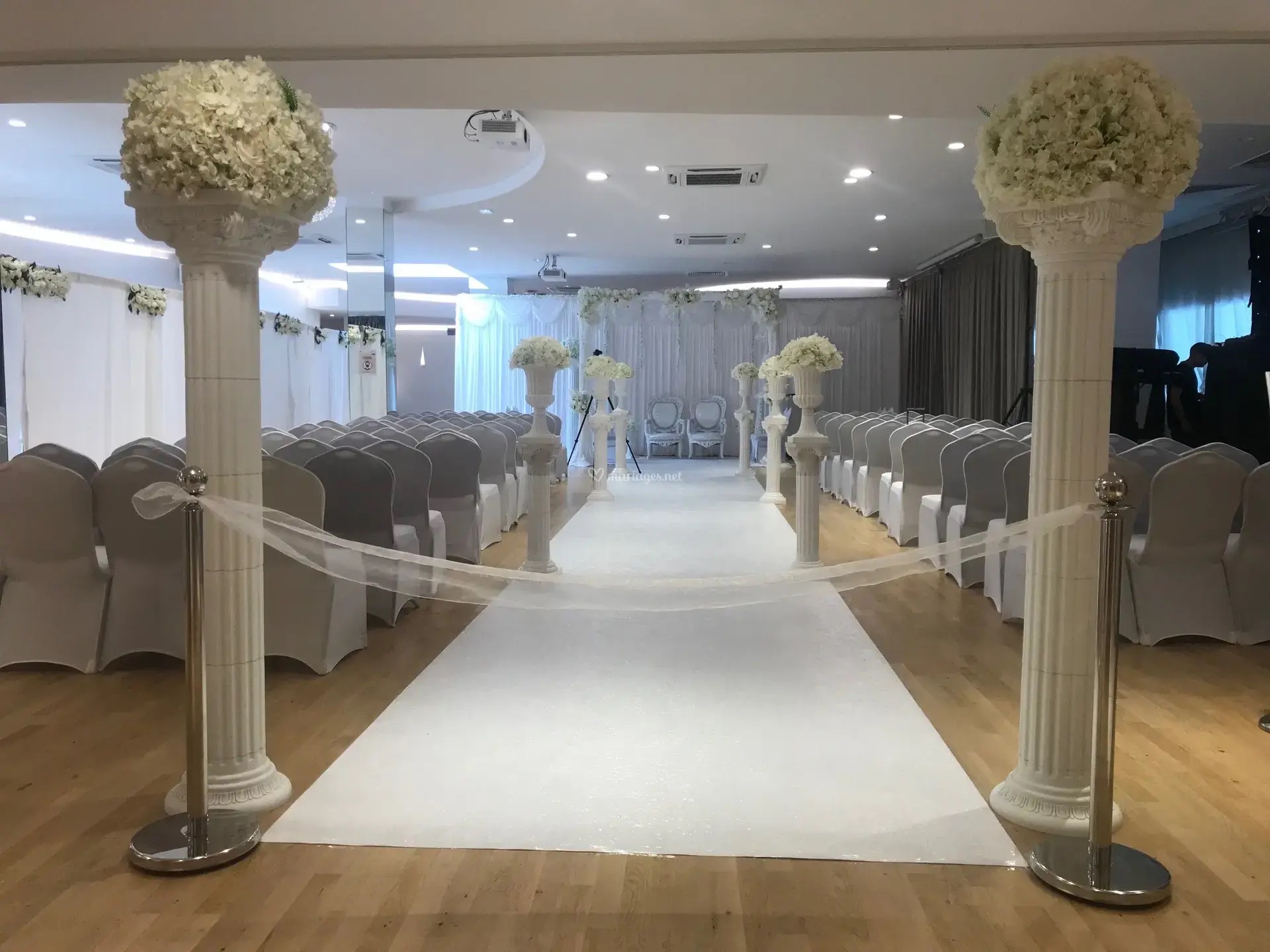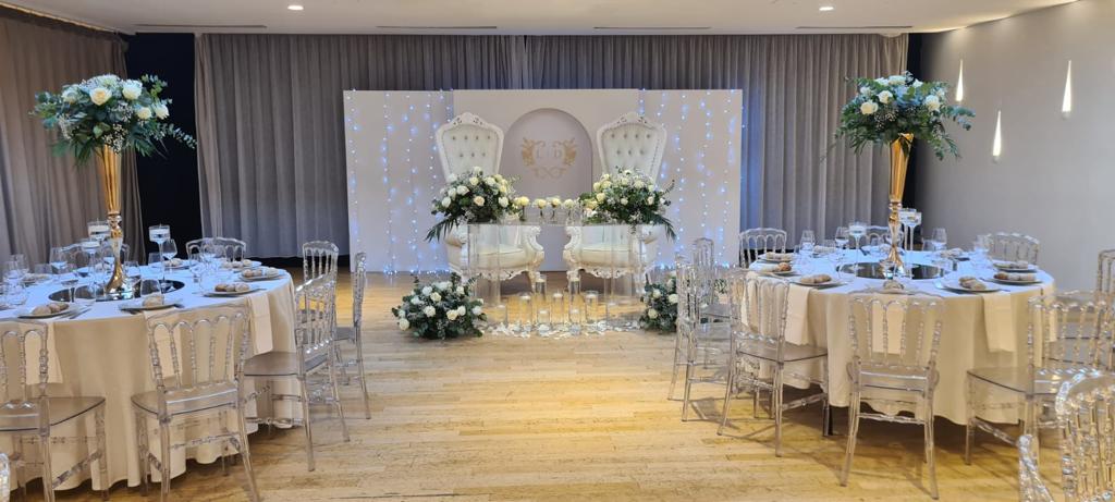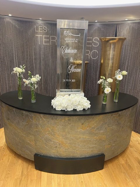 La décoration contemporaine aux tons blancs, beiges et dorés apporte une atmosphère douce et chaleureuse, parfaite pour sublimer votre célébration.