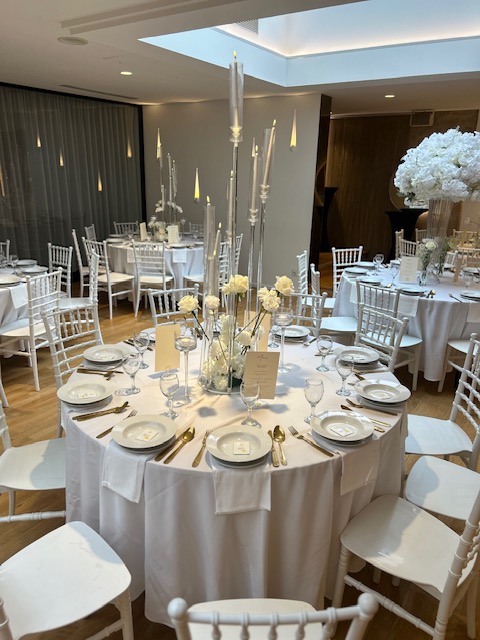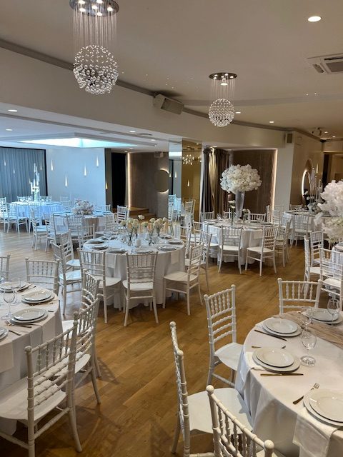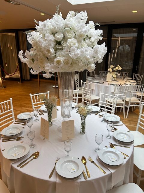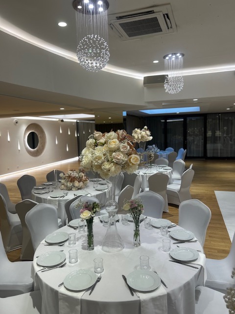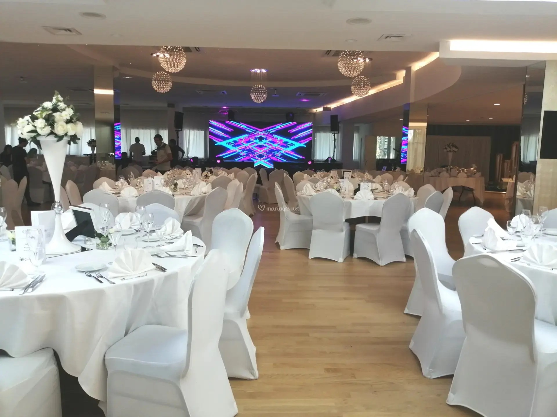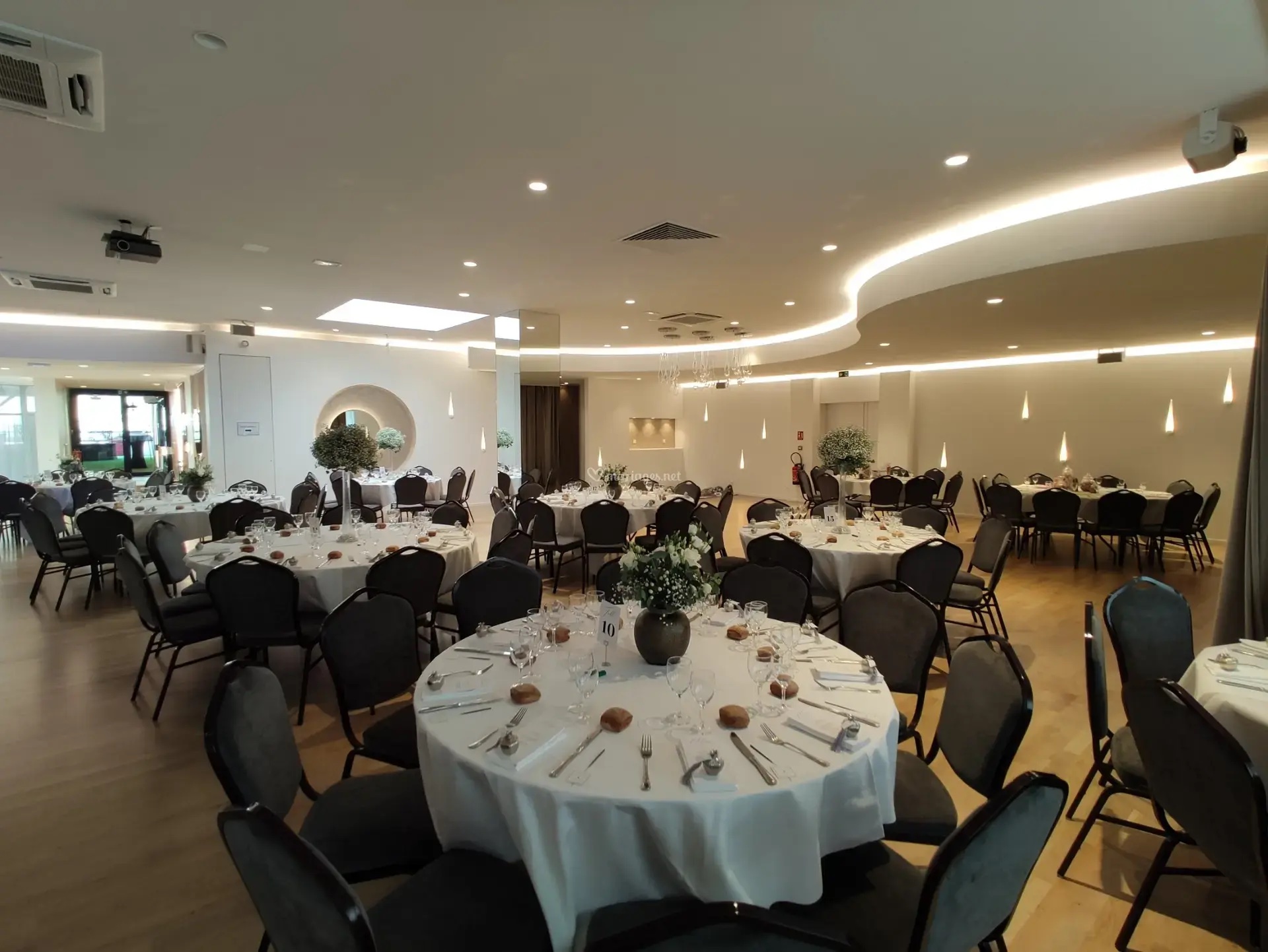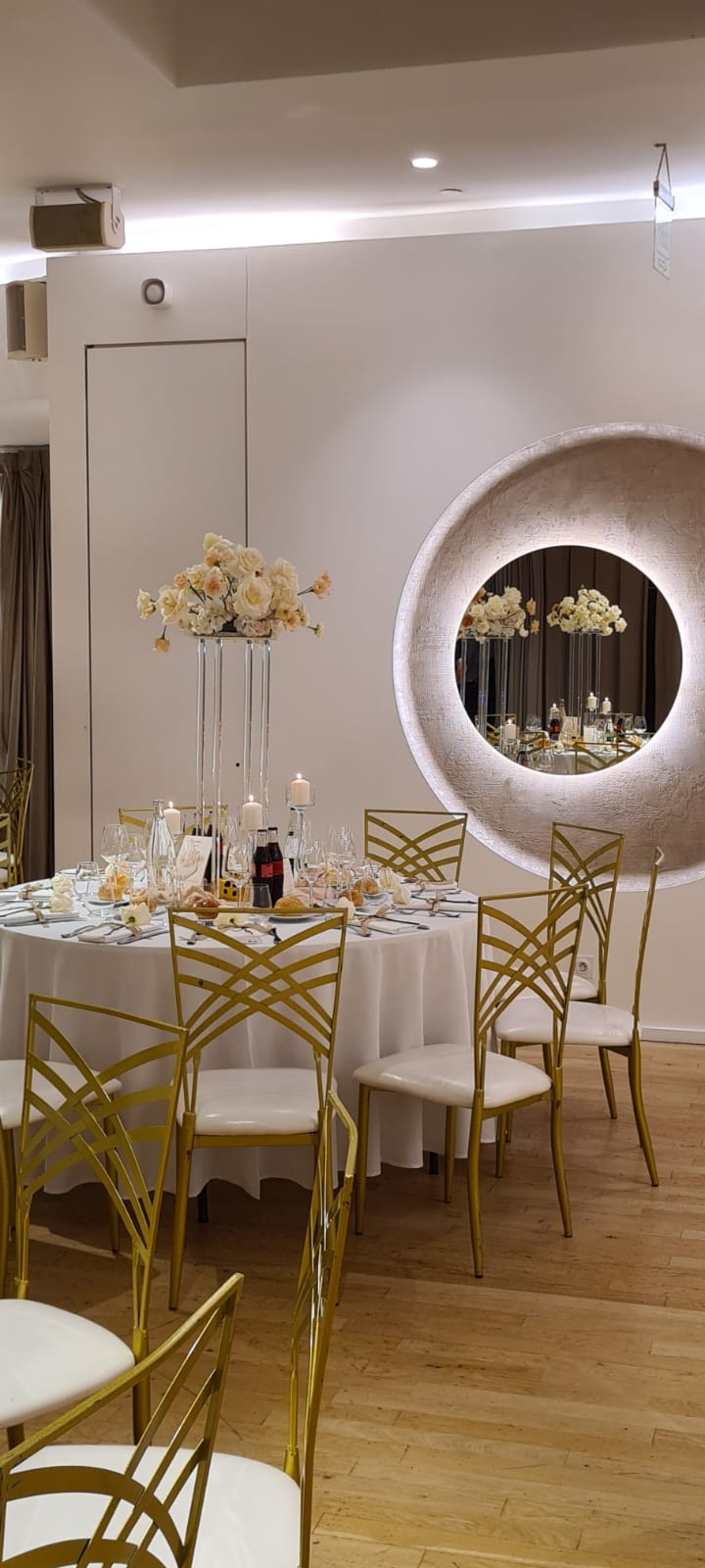 La décoration contemporaine aux tons blancs, beiges et dorés apporte une atmosphère douce et chaleureuse, parfaite pour sublimer votre célébration.