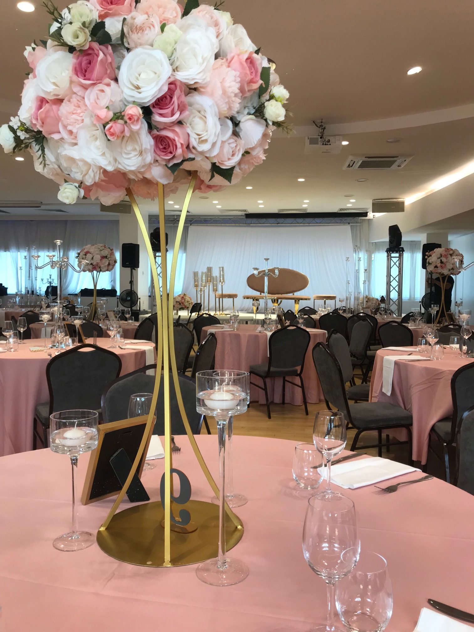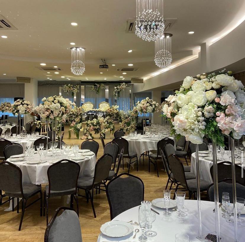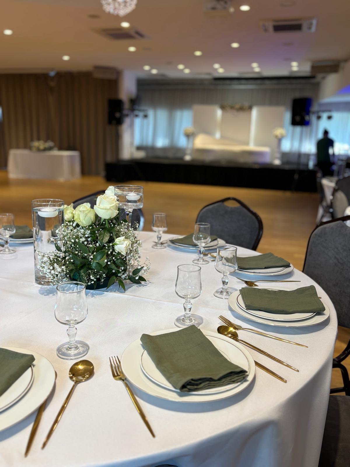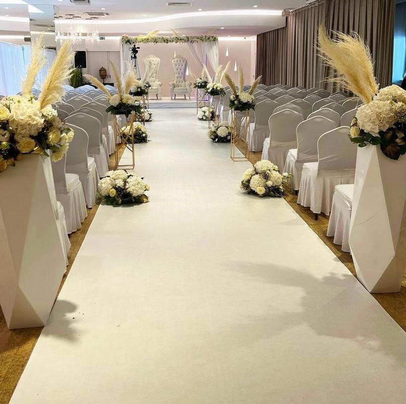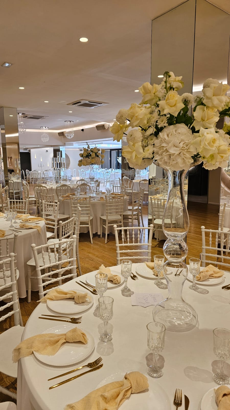 La décoration contemporaine aux tons blancs, beiges et dorés apporte une atmosphère douce et chaleureuse, parfaite pour sublimer votre célébration.
